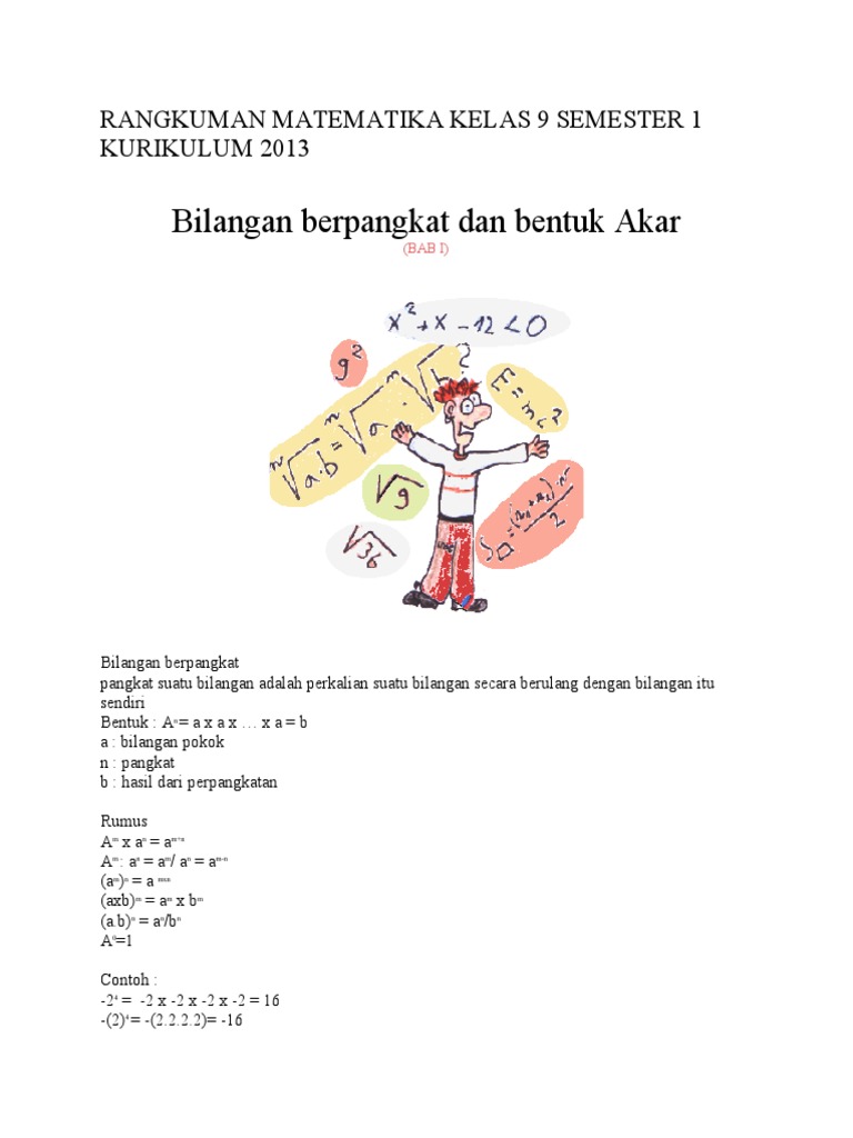 Rangkuman Matematika Kelas 9 Semester 1 Kurikulum 2013 from 1.bp.blogspot.com Langsung ke konten utama ringkasan buku sekolah language translator telusuri. Bilangan berpangkat a n dengan n bilangan bulat positif: Perpangkatan dan bentuk akar alokasi waktu : Pada postingan kali ini, akan dibahas tentang hal tersebut secara rinci mulai dari bilangan berpangkat bilangan bulat, bentuk akar dan bilangan berpangkat pecahan. Pembahasan soal uji kompetensi 1 matematika kelas 9 (ix) smp/mts semester 1 kurikukum 2013 edisi revisi 2018 pada materi soal bab 1 perpangkatan dan bentuk a. Soal matematika kelas 9 bab perpangkatan dan bentuk akar. Materi perpangkatan masuk ke dalam bab 1 materi pelajaran matematika kelas 9 semester 1. Kunci jawaban matematika kelas 9 latihan 1.3 halaman 30 31 32 bab berpangkatan dan bentuk akar semester 1kurikulum 2013 edisi revisi 2018 buku mtk kelas 3 smp mts hallo temen temen selamat datang di blog ilmu edukasi, blog ilmu edukasi berisikan kunci jawaban buku pelajaran mi sd, smp, mts, sma, smk, ma, mak pasti dapat nilai 100